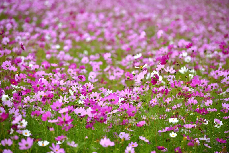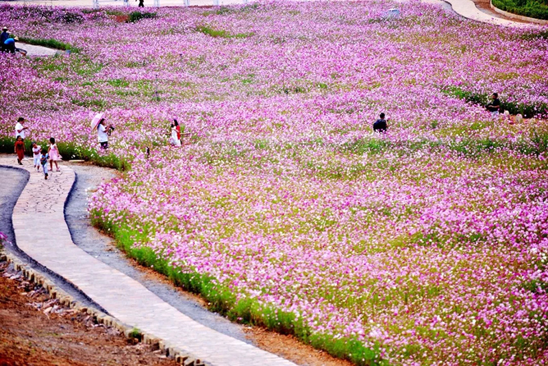 粉的、白的、紫的,開在靜默的時光里、開在微風(fēng)中恣意飄蕩,阡陌縱橫的鄉(xiāng)間小路被明艷靚麗的顏色,一望無際的花海包裹著藍天白云綠草如茵。