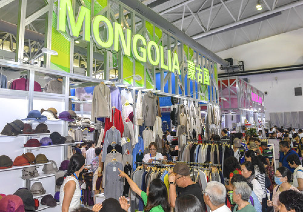 8月25日,觀眾在蒙古國商品展位選購服裝、帽飾。