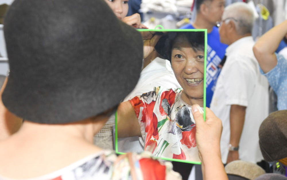 8月25日,觀眾在蒙古國商品展位試戴羊毛帽子。
