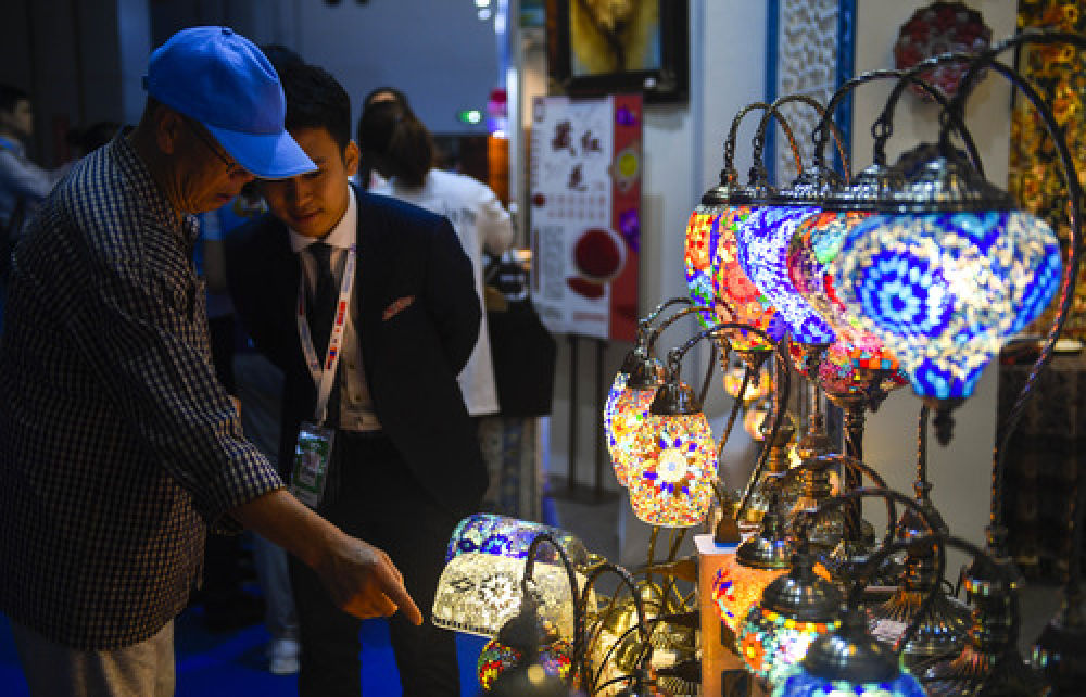 觀眾在博覽會上選購伊朗彩色玻璃藝術(shù)燈(8月23日攝)。