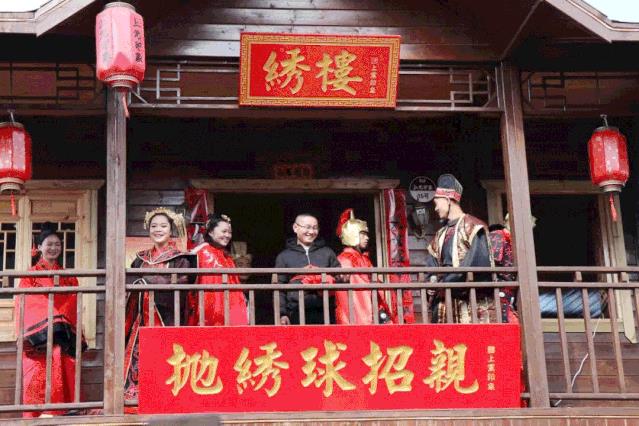 聽說王員外奉旨嫁女,特開彩樓為女兒招婿,搶到繡球的游客不僅可以跟王家三小姐拜堂成親,還可以體驗當?shù)赜H民俗!偷偷看了兩眼,王員外家三小姐長得還是蠻好的!