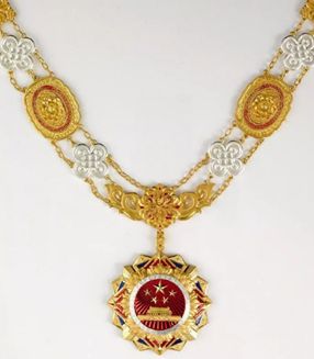 國家榮譽稱號獎章以紅色、金色為主色調,章體采用五星、天安門、牡丹、旗幟、光芒等元素,章鏈采用中國結、花卉等元素,整體使用冷壓成型、花絲鑲嵌、琺瑯等工藝制作,象征國家榮譽稱號獲得者在各領域各行業(yè)作出的重大貢獻,彰顯示范引領作用,激勵全國各族人民不忘初心、牢記使命,為實現(xiàn)中華民族偉大復興的中國夢而不懈奮斗。