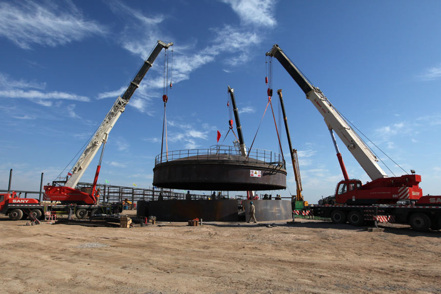 大慶油田工程建設進行伊拉克哈法亞油田CPF1項目3000立罐體吊裝罐體安裝。趙永安 攝 大慶油田供圖