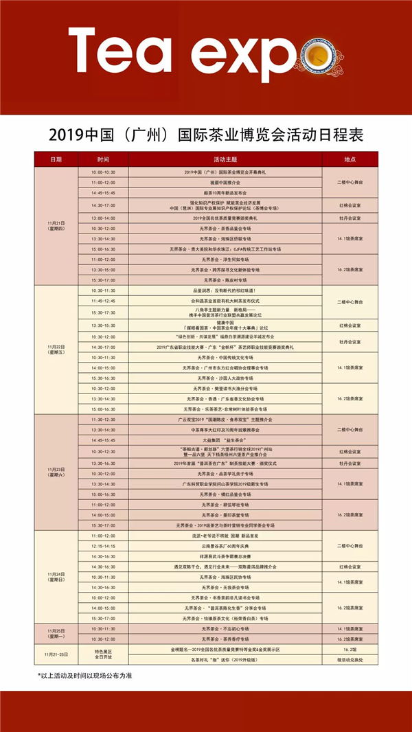 有品牌推介會:中茶尊享大紅印及班章推薦會,品鑒潤思:沒有斷代的祁紅味道!“綠色創(chuàng)新·共謀發(fā)展”福鼎白茶溯源建設(shè)羊城發(fā)布會,“茶船古道·新絲路”六堡茶行銷全球2019廣州站暨一品六堡天下梧茶梧州六堡茶產(chǎn)業(yè)推介會,駿眉中國推介會,廣云雙寶2019“國潮陳皮·食養(yǎng)雙寶”主題推介會,大益集團(tuán)“益生茶會”,遇見雙陳干倉,遇見行業(yè)未來——雙陳普洱品牌推介會等;有新品首發(fā):巔茶10周年新品發(fā)布會,合和昌茶業(yè)首款有機(jī)大樹茶發(fā)布儀式,流派?老爺說不將就國潮新品首發(fā)等;有賽事、論壇和慶典:八角亭主題新力量新格局——攜手中國普洱茶行業(yè)聯(lián)盟共贏發(fā)展論壇,2019年首屆“普洱茶在廣東”制茶技能大賽·頒獎儀式,祥源易武斗茶爭霸賽總決賽,云南景谷茶廠60周年慶典等等。