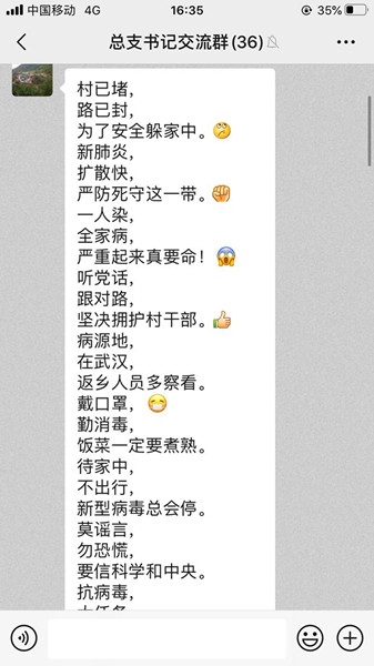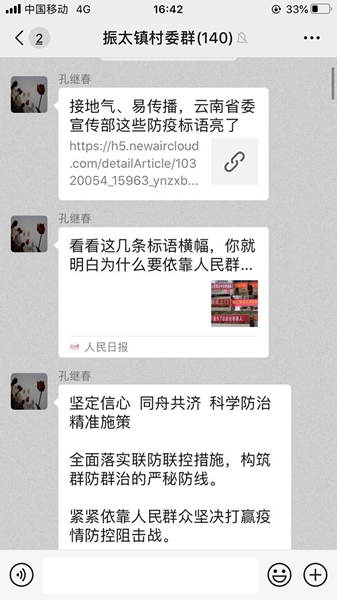 “1693個”疫情防控微信群聊起來。各鄉(xiāng)鎮(zhèn)各部門積極運用微信、電話、短信、微博等宣傳媒介正面對疫情防控進行宣傳,做到不信謠、不傳謠、不造謠。及時在微信平臺、村組微信群、朋友圈上轉(zhuǎn)發(fā)國家、省、市、縣相關(guān)疫情通報和防控知識宣傳,進一步擴大新型冠狀病毒感染預防知識宣傳面,1693個微信群,轉(zhuǎn)發(fā)相關(guān)宣傳知識31016條,評論相關(guān)信息2292條,覆蓋人數(shù)5萬余人。通過發(fā)布手機短信宣傳標語10條,覆蓋人數(shù)15000余人,群發(fā)疫情防控知識彩信13萬條,群眾知曉率達100%以上。