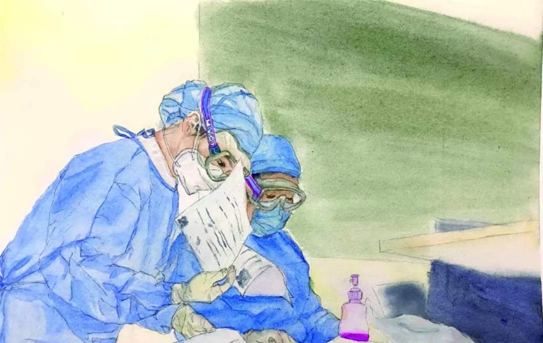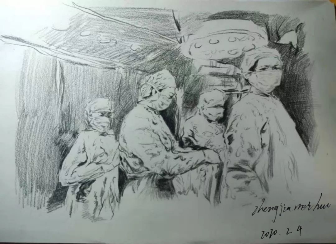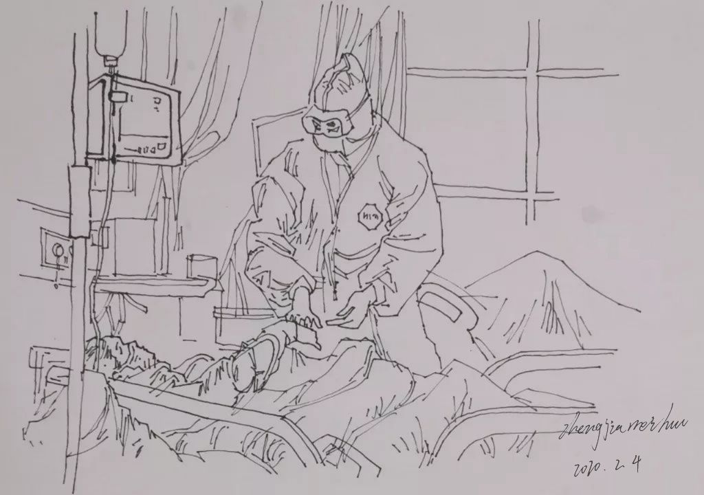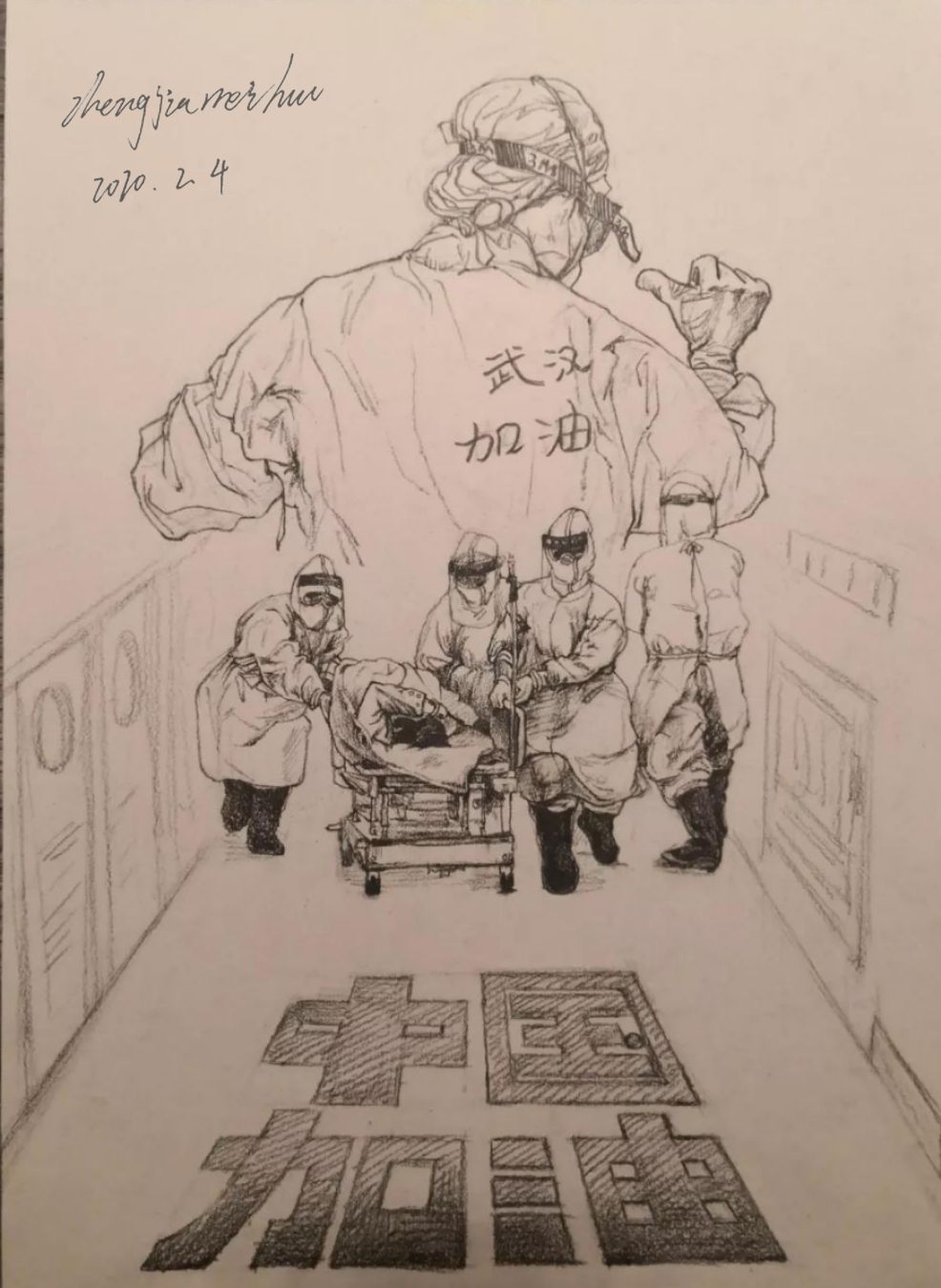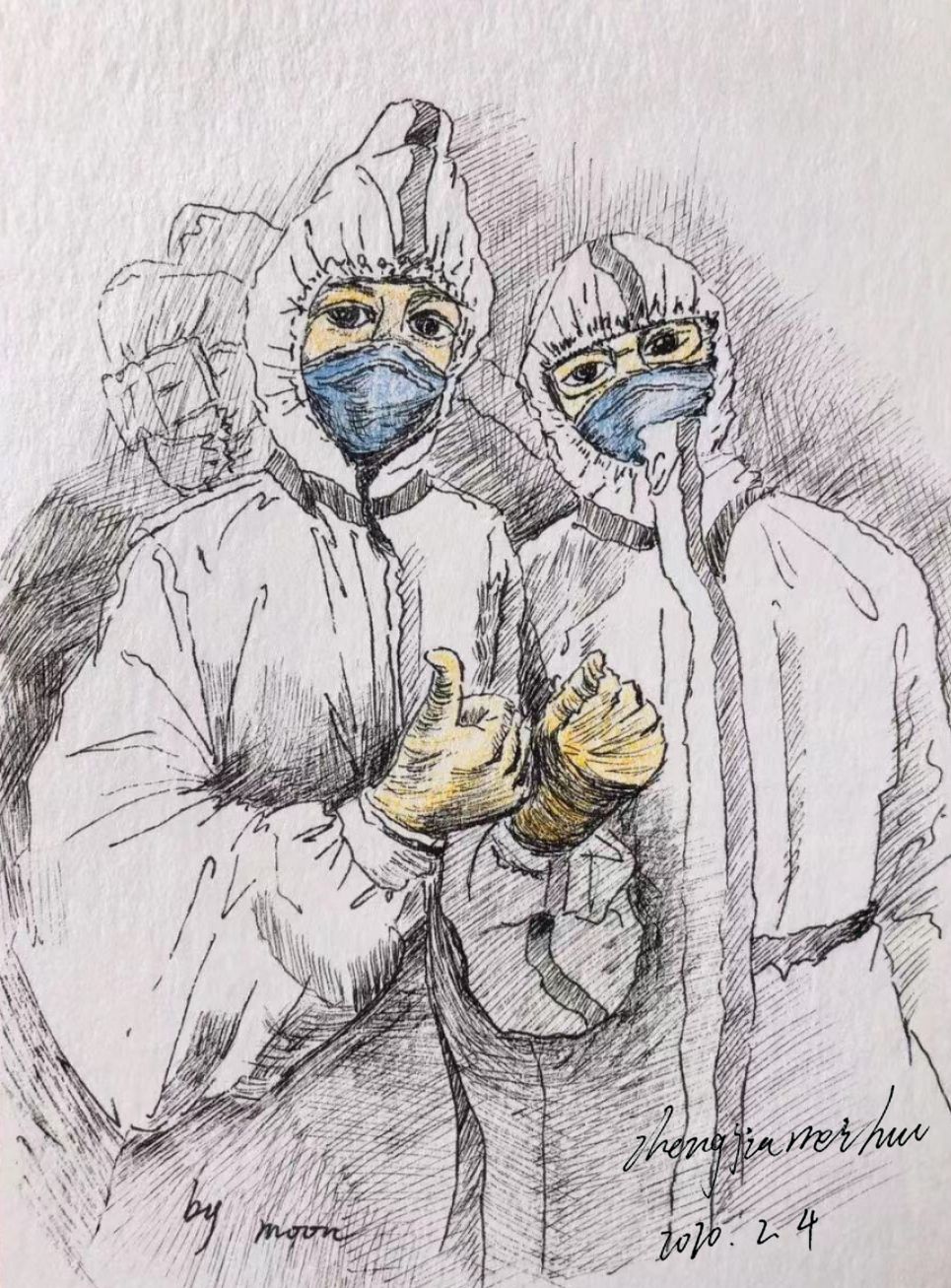 “這些醫(yī)務(wù)工作者的眼里只有病人而沒有危險(xiǎn),他們一天工作十幾個(gè)小時(shí)。我覺得他們特別了不起,深受感動(dòng)。于是,她用她最喜歡的方式---繪畫,用墨色線條勾描形象,簡(jiǎn)單直接地表現(xiàn)那些不顧個(gè)人安危,戰(zhàn)斗在抗疫一線的醫(yī)生和護(hù)士,抒發(fā)對(duì)他們的崇敬之情,并希望能以此提振大家信心,眾志成城奮戰(zhàn)疫情。