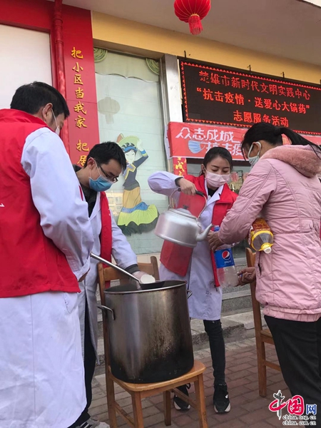 ( 2月9日云南楚雄州楚雄市新時(shí)代文明實(shí)踐站志愿者為市民“抗擊疫情,送愛心大鍋藥”。)