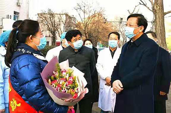 上午9點,中鐵三局集團(tuán)公司黨委書記、董事長郝剛,工會主席、副總經(jīng)理馬文亮前來給援鄂英雄送行。郝書記叮囑她說:作為代表中鐵三局的醫(yī)務(wù)人員,一切行動要服從指揮,你在前線“打仗”,在救治患者的同時也要做好自我保護(hù),保護(hù)好自己才能救更多的人,中鐵三局就是你堅強(qiáng)的后盾,等著你平安歸來……”