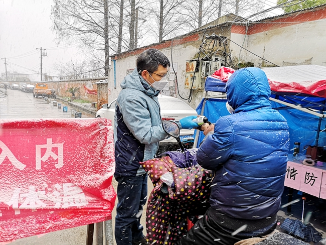 我的父母退休前一直從事的是疾控工作,2月13日我也加入了他們曾經奮戰(zhàn)的隊伍,成了社區(qū)防疫戰(zhàn)線上的一名戰(zhàn)士,這讓我更加地激動,也更有信心做好社區(qū)防控工作。今天是我值守的第三天,天下起了鵝毛大雪,氣溫驟降。下午黨支部書記湯峰冒著大雪給我送來了雨傘,保溫杯,餅干等愛心物資以及集團公司黨委的牽掛,并一再囑咐我要做好防寒保暖和自我防控工作。雖然風雪交加、寒風凜冽,但我的內心無比溫暖,我知道我不是一個人在戰(zhàn)斗。