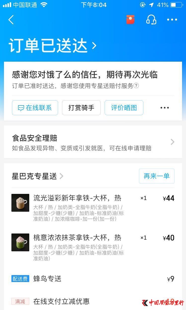 “2019年1月6日下午,我通過專星送買了兩杯咖啡和朋友一起喝。新年嘛,特別選了兩款新年特供,結(jié)果朋友那杯‘流光溢彩新年拿鐵’咖啡加了一份濃縮咖啡的,味道還是淡,而且有股怪怪的中藥味,非常失望。另一杯‘桃意濃濃抹茶拿鐵’咖啡基本沒有桃味,滿嘴抹茶味,而且特別甜膩,完全沒有抹茶或桃的清爽。除此之外,喝完咖啡后,我們兩人分別有一定程度胃難受,頭暈等不適癥狀?!鄙虾OM(fèi)者李女士稱。