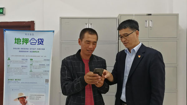 建行哈爾濱延壽支行副行長(zhǎng)、駐新合村第一書記董志剛(右)在指導(dǎo)鄭雙承(左)用手機(jī)“惠懂你”辦理“地押云貸”(攝影:李浩)