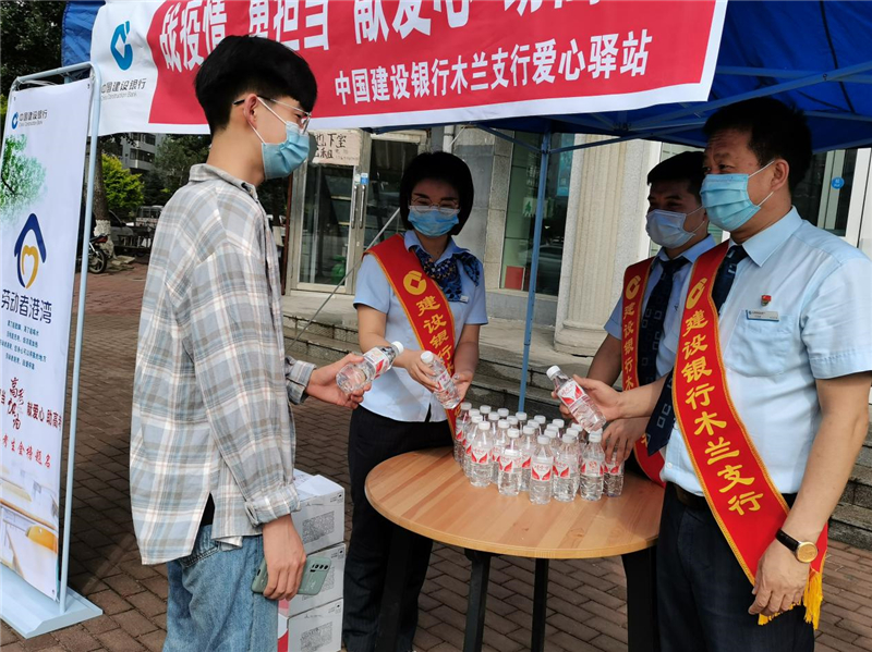 (建設(shè)銀行木蘭支行“愛心驛站”為考生免費發(fā)放飲用水 攝影:鄭鵬瀧)
