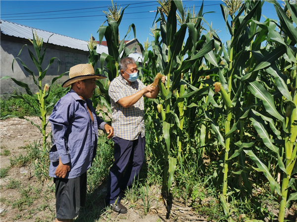 雙城建行駐雙城區(qū)永勝鎮(zhèn)永興村駐村書記崔文巍(右)與貧困戶荊國(guó)民(左)查看玉米長(zhǎng)勢(shì)(圖/張曉鵬)