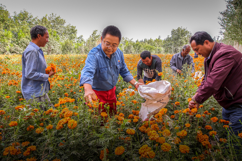 喀什地區(qū)莎車縣烏達(dá)力克鎮(zhèn)巴格買里村第一書記胡曉軍與駐村工作隊人員幫村民艾海提·艾麥爾采摘萬壽菊