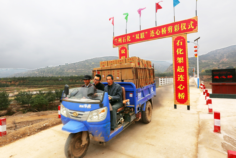 蘭州石化為甘肅平?jīng)鍪胸毨Т逍藿恕斑B心橋”,村民的蘋果能及時地運到城里出售。以前因道路不暢,近一半的蘋果爛在地里。(酈鑫攝).