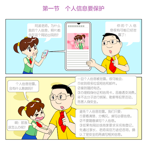 南都記者查閱發(fā)現(xiàn),教材章節(jié)涉及安全上網(wǎng)、抵制不良信息等內容,并以卡通人物對話,圖文并茂的形式告知學生如何保護個人信息。比如教材提到,如果有網(wǎng)站或商家要求實名制登記,同學們應該先通過家長、老師或官方途徑咨詢,確認安全后再填寫相關信息。