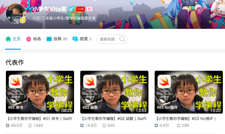 剛剛升入小學三年級的Vita君熱愛編程和數(shù)學。去年暑假,他將錄制的一些用Swift Playgrounds軟件學習編程的視頻上傳到B站,而后收獲許多人的關注。作為一名10后,Vita君說自己是互聯(lián)網(wǎng)的“原住民”——從小就知道爸爸媽媽每天都在網(wǎng)上看視頻、買東西、玩游戲,互聯(lián)網(wǎng)伴隨著他長大。