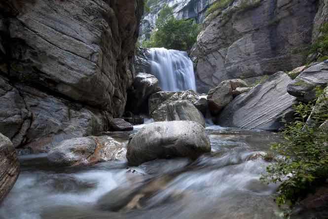 云花溪谷是八百里太行的重要組成部分,屬于典型的峽谷山地型地貌,區(qū)內(nèi)山巒起伏、峽谷縱橫,有峽谷、丘陵、梯田、平田、河灣、沙洲、瀑布、跌水、深潭、淺灘等多樣的地形。云花溪谷的地貌總體上表現(xiàn)為“南北兩高峰,九溪匯一河”?!澳媳眱筛叻濉奔茨羡纾倒遨?,海拔2281米)和北坨(百草坨),“九溪匯一河”即西部的面盆溝、羊道溝、二道莊溝三條主要溪流,在舊營村一帶匯合成為胭脂河。