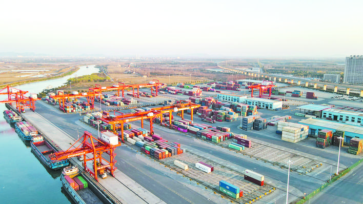 2月21日,合肥港國際集裝箱碼頭開工后出現(xiàn)一派繁忙的運(yùn)輸情景。今年1月份,集裝箱吞吐量完成29384標(biāo)箱,同比增長23.7%。截至2月19日,集裝箱吞吐量完成44652標(biāo)箱,同比增長33.2%。(記者 宋炎駿攝)