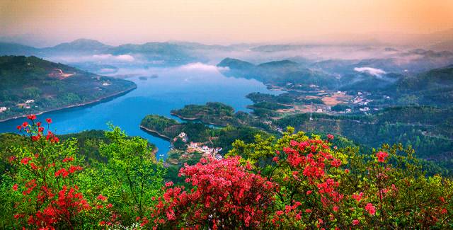 一簇簇映山紅在翠綠的山嶺旁競相開放