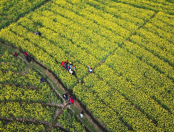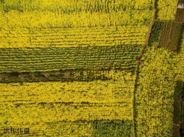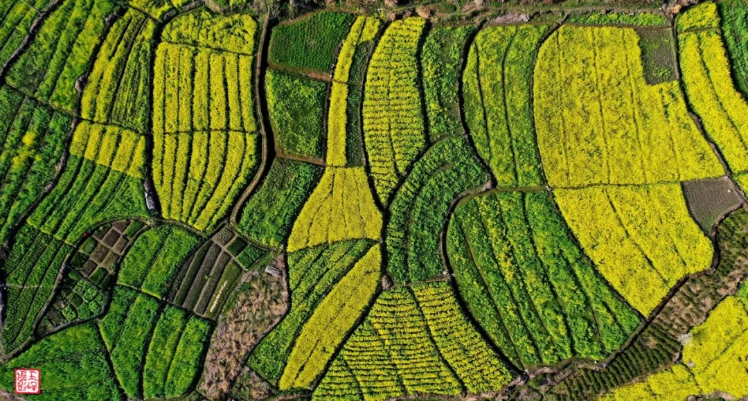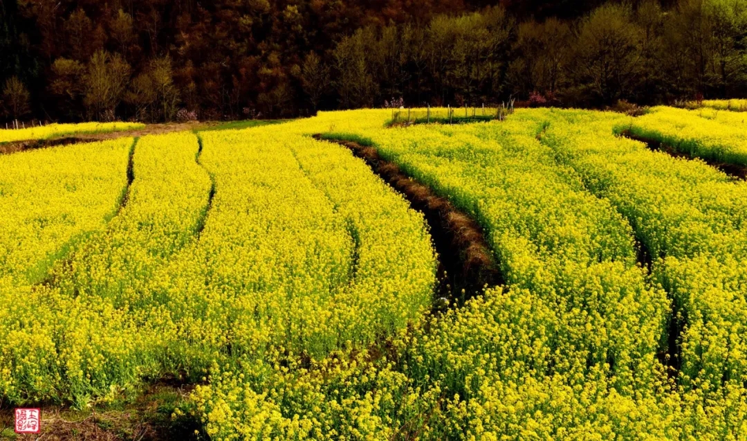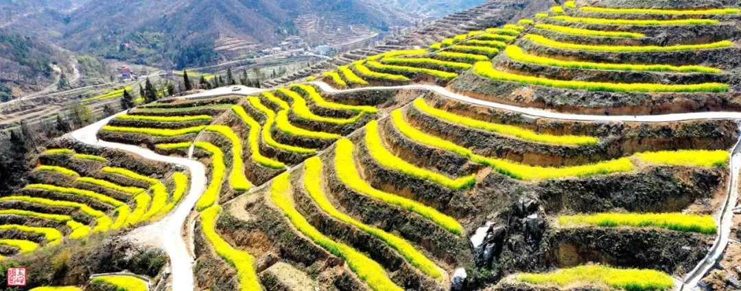 花海連著梯田,從山坡鋪散到山谷下,好像一塊塊黃綢鋪在青山綠水間。中間圍攏著幾個或大或小的村落,紅瓦白墻的民居夾雜其中,形成獨具一格的鄉(xiāng)村田園畫......