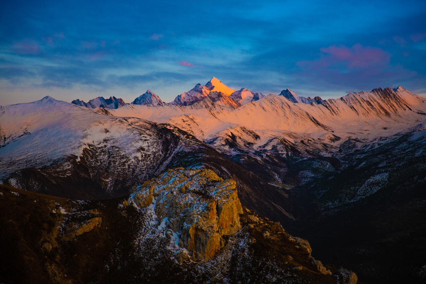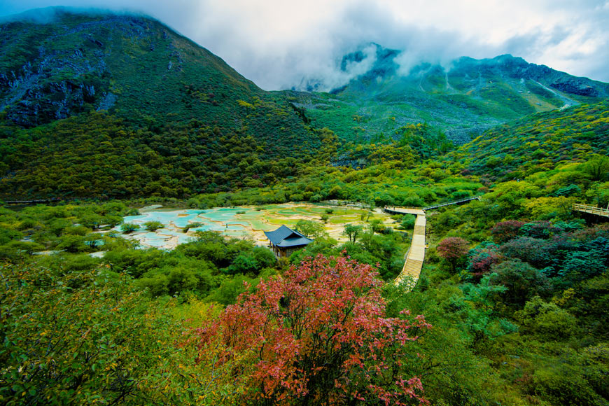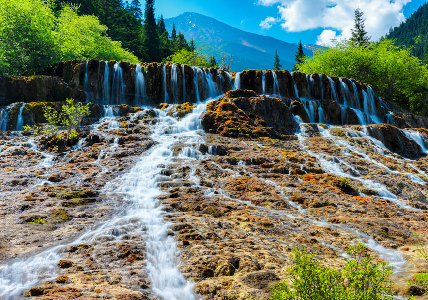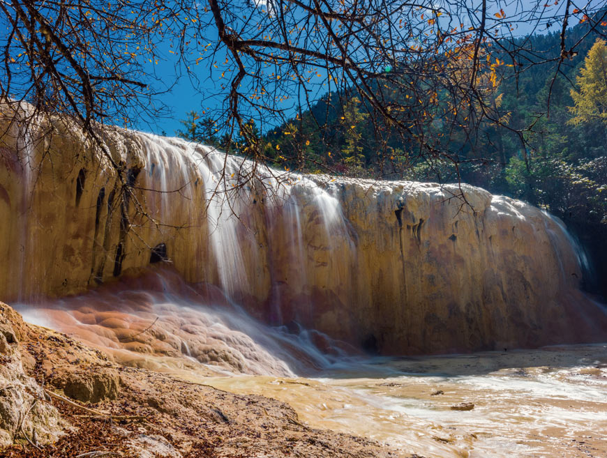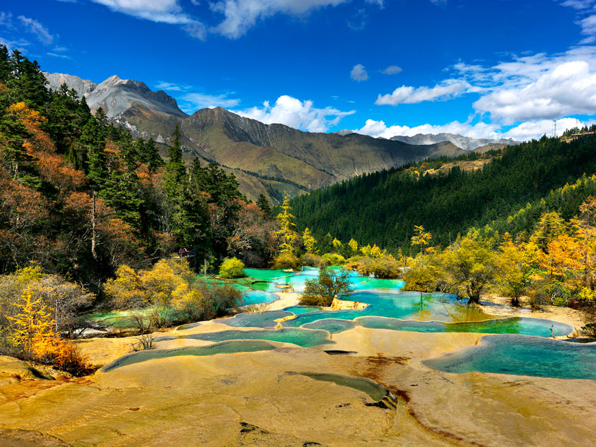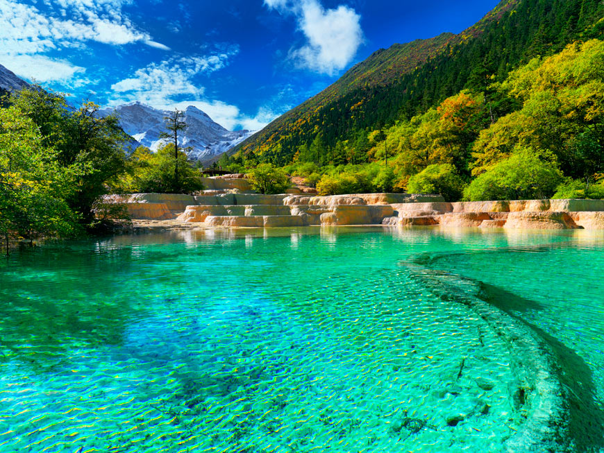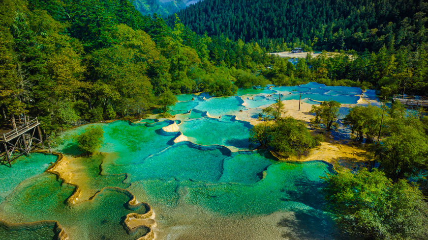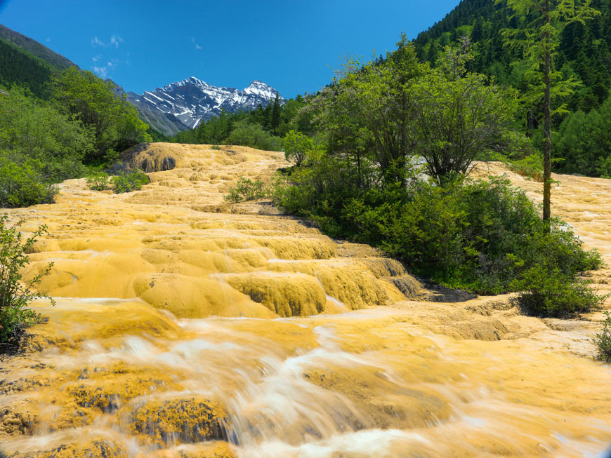 巨型的地表鈣華坡谷,如一條金色巨龍,蜿蜒于原始林海和雪山冰峰之間。富含碳酸鈣的清澈泉水,在地表大量沉積,營(yíng)造出壯觀的鈣華灘流-金沙鋪地、結(jié)構(gòu)精巧的鈣華彩池群落-五彩池和獨(dú)特的鈣華塌陷壁-洗身洞等巖溶鈣華景觀。