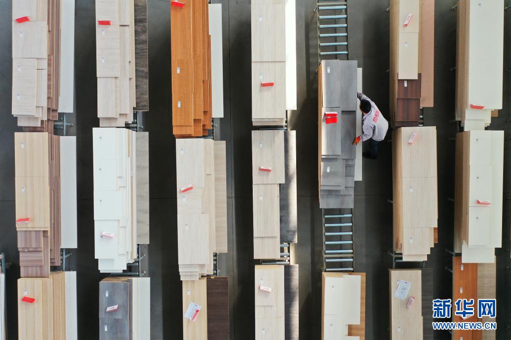4月15日,在位于河北省唐山市漢沽管理區(qū)的河北英邁木業(yè)有限公司,工人在整理定制家具面板(無人機(jī)照片)。
