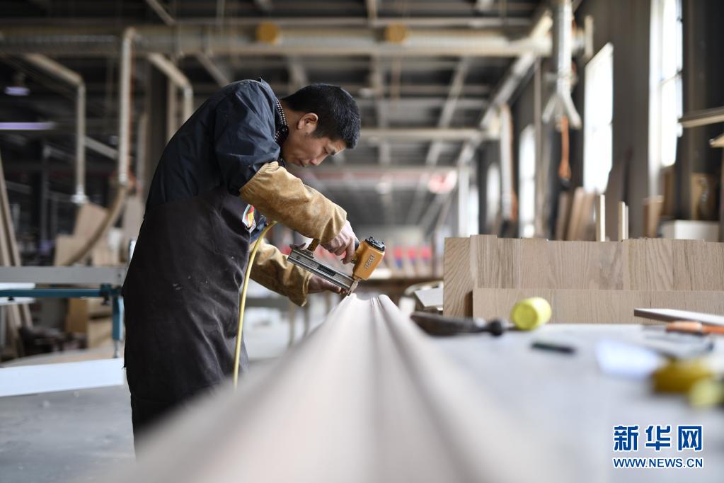 4月16日,河北省唐山市漢沽管理區(qū)宅本木業(yè)有限公司工人在車間加工定制家具部件。