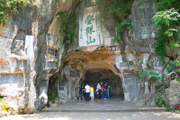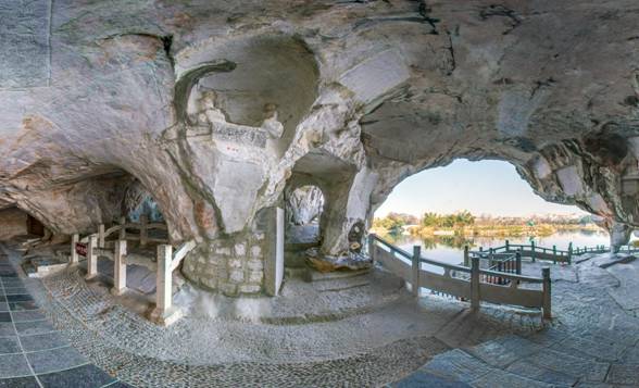 伏波山現(xiàn)存摩崖石刻112件,其中藝術(shù)價值最高的是宋代大書畫家米芾的自畫像和親筆題名;疊彩山半山風(fēng)洞處精美石刻隨處可見,風(fēng)洞右上方陳毅元帥“愿作桂林人,不愿作神仙”石刻。