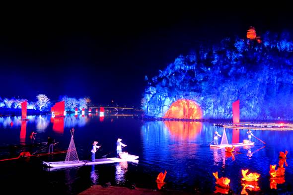 景區(qū)還有特色的文藝演出節(jié)目,其中有依托桂林古代戰(zhàn)時烽火城墻遺址,融合了地方非遺文化——劉三姐和阿牛哥傳奇愛情故事的木龍湖光影秀、有傳承千年的漓江漁民傳統(tǒng)原生態(tài)魚鷹捕魚表演、有展現(xiàn)瑤族文化的荷塘梳妝等。另外,桂湖漁火秀是目前桂林市陣容最宏大、場面最壯觀、表演技法最傳統(tǒng)的原生態(tài)魚鷹捕魚表演秀。