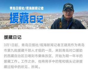 青島日?qǐng)?bào)社/觀海新聞?dòng)浾咄踅羺⑴c援藏工作,用細(xì)膩的筆觸和真切的感情記錄、傳播西藏新發(fā)展,溝通高原大海,書(shū)寫(xiě)時(shí)代篇章