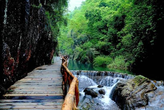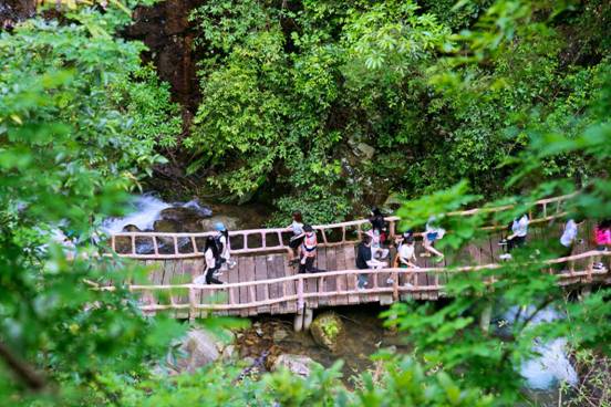 海船木棧道是白水仙瀑景區(qū)最受歡迎的游覽線路,也是國內(nèi)唯一用海船木建造的親水棧道。棧道全程沿著峽谷、緊貼著溪流、迎著瀑布修建,我們走在上面可以觀瀑、戲水,呼吸一下混合了空氣負離子、森林精氣的、還透著水霧的清涼空氣。漫步其上,游走峽谷,格外寫意休閑,故有廣東最美徒步路線的美譽。