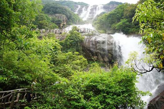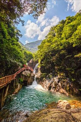 699級雙龍匯是白水仙瀑最著名的景點之一,白水仙瀑奔流于峽谷之中,在山澗遇到巨石后一分為二,分開的水流好像兩條潔白的蛟龍盤旋而下,最后匯合而成一池碧綠。在陽光的照耀下,還會邂逅到七色的彩虹呢!