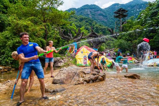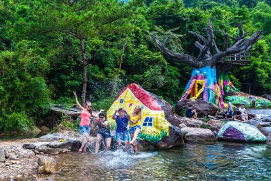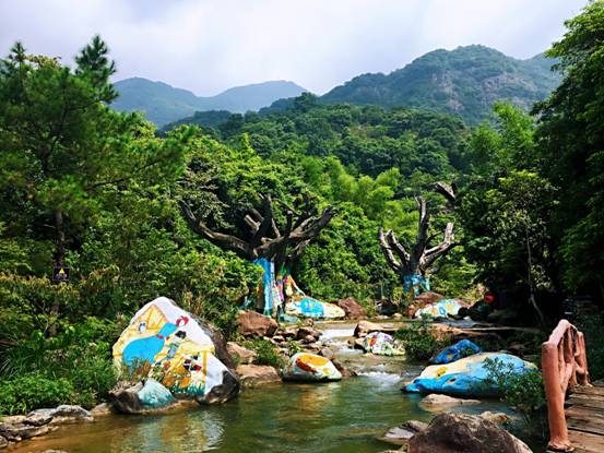 在奇趣水谷我們可以體驗到戲玩自然山水的野趣?!皦艋脜擦帧彼F彌漫、非常涼爽;“疊趣水澗”蜿蜒曲折、石頭奇趣各異,“童話森林”更是充滿卡通夢幻色彩,石頭上和樹上都描畫了河馬、斑馬、鸚鵡等森林里可愛的小動物,還有五彩繽紛的花朵點綴其中,惟妙惟肖,奇趣紛呈,有如走進神秘的夢幻森林。