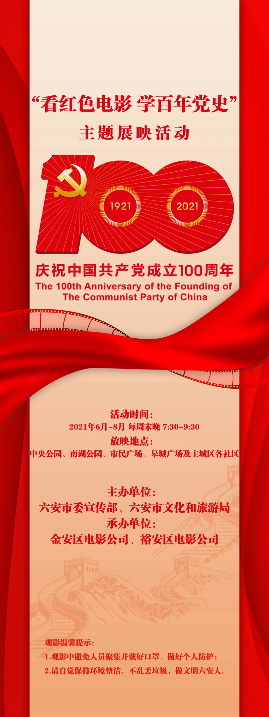 為慶祝中國共產黨成立100周年,展示中國共產黨百年光輝歷程和偉大功績,豐富城區(qū)居民精神文化生活,中共六安市委宣傳部、六安市文化和旅游局組織“看紅色電影學百年黨史”主題展映活動。通過系列紅色影片,用鏡頭帶大家走進那一段崢嶸歲月,共同學習黨的百年光輝歷史。