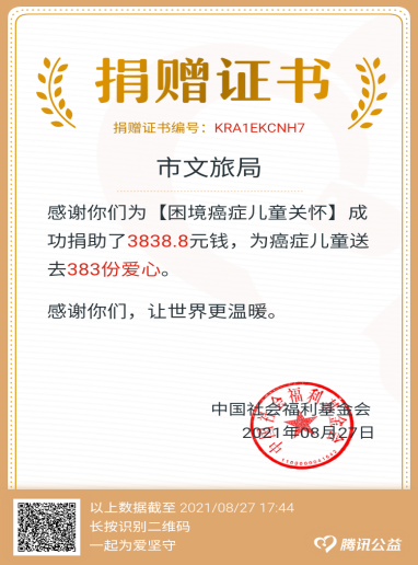 線上掃碼募捐獻愛心?;顒悠陂g,我局通過在微信群、QQ群推送公益活動情況介紹和有關通知精神,積極動員機關各科室以及局屬各單位,號召大家愛心不分大小,積極主動參加,為困境兒童送去溫暖和希望。截至8月27日,我局已有97人參與掃碼募捐活動,籌集捐款共3838.8元。