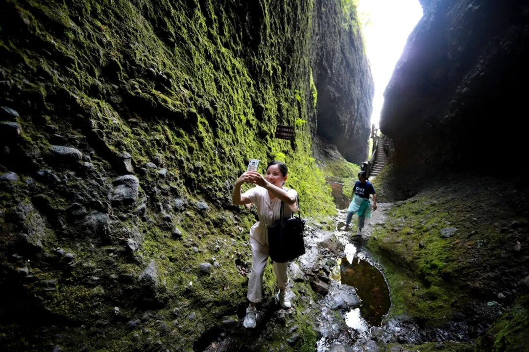 皖西大裂谷是金安區(qū)九十山水畫廊上一顆璀璨的明珠,此行第一站,一定要來(lái)打打卡!皖西大裂谷山、水應(yīng)有盡有,最刺激的莫過(guò)于開(kāi)始登陸真正的裂谷了:這里分為三道閘,第一、二道閘可以比較輕松的度過(guò),但是從第三道閘開(kāi)始,就需要格外小心了,第三道閘窄到甚至一人通過(guò)都比較困難。順著鋪設(shè)的木階前進(jìn),會(huì)越走越高,若恐高的游客此時(shí)不建議回頭看,畢竟大裂谷的奇險(xiǎn)是其特色之一。一路上伴隨著山石上嫩綠的青苔和流水潺潺聲,經(jīng)過(guò)約半小時(shí)的路程即可抵達(dá)山峰頂端,到達(dá)頂峰后,可以選擇玻璃滑道一滑而下,重拾兒時(shí)樂(lè)趣。