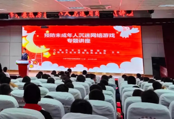 本次專(zhuān)題講座近300名同學(xué)參加,發(fā)放印有預(yù)防沉迷網(wǎng)絡(luò)游戲宣傳標(biāo)語(yǔ)的文具袋、水杯、雨傘等宣傳品近400件。(六安市文化和旅游局供稿)