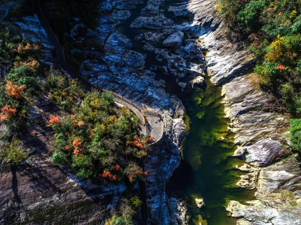 溫暖的陽光還停留在峽谷之中,山林里最后一批紅葉還傲然挺立在枝頭,鮮紅、碧綠與蒼黃,這并不調和的色調,組成了別具一格的峽谷冬景。