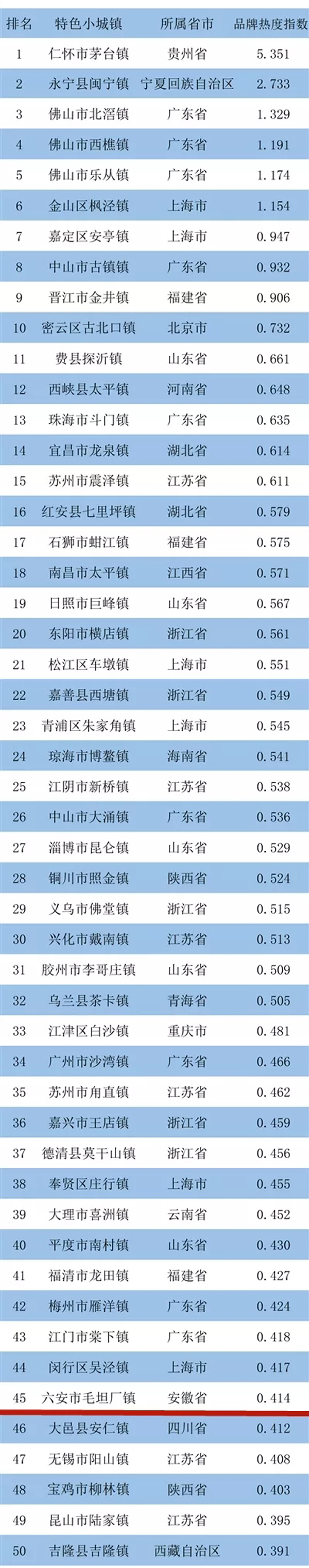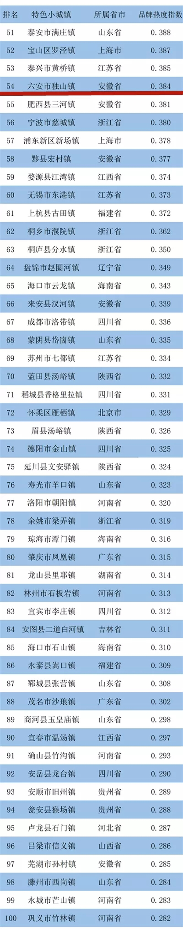 六安市毛坦廠鎮(zhèn)位列第45位,六安市獨(dú)山鎮(zhèn)位列第54位。