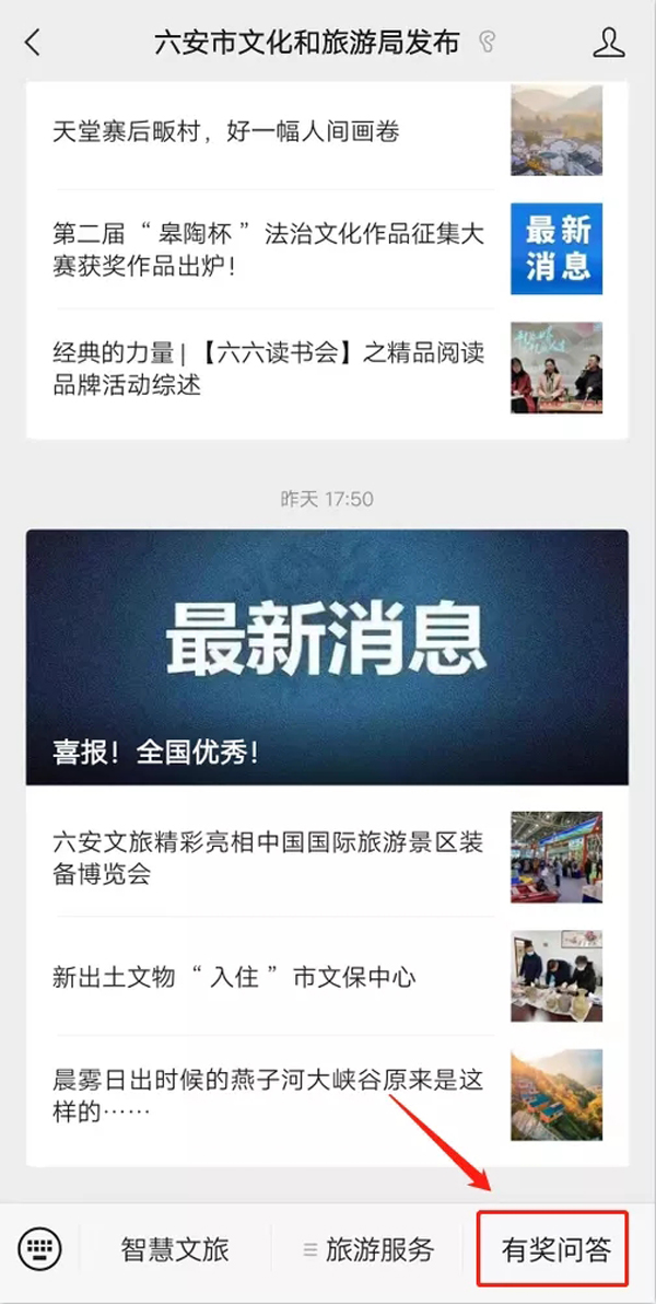 方式一:進(jìn)入“六安市文化和旅游局發(fā)布”微信公眾號(hào),點(diǎn)擊自定義菜單“有獎(jiǎng)問答”,即可參與答題。(或進(jìn)入“六安市圖書館”和“六安市文化館”微信公眾號(hào))