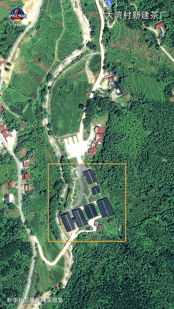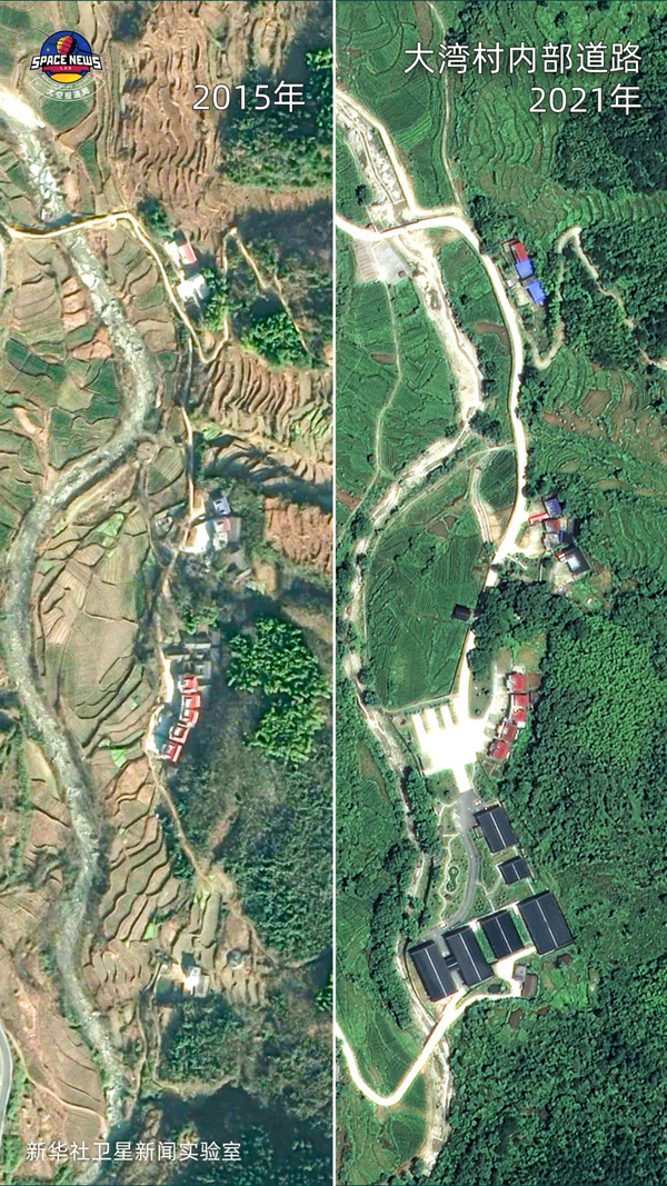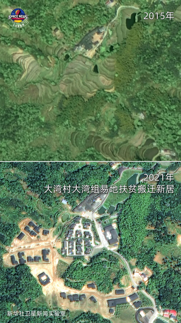 ▲衛(wèi)星見證了易地扶貧搬遷新居“從無到有”。大灣村共建設(shè)4個易地扶貧搬遷新居點,搬遷群眾129戶439人。
