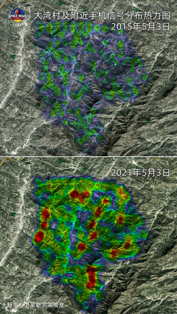 ▲有色區(qū)域代表手機信號,信號密度越大,顏色越深。與2015年相比,更大范圍、更密集的手機信號,反映出大別山區(qū)大幅增長的人流量。