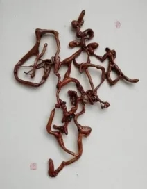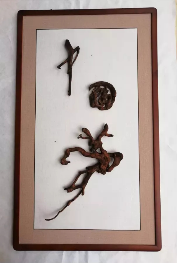 根藝書法是一種天趣。作品不是“書”出來的,而是通過看選審,“悟”出來的。天然根藝書法,需要充分利用根的自然生長形態(tài),因其自然,隨形賦字,并通過漢字的間架結構、行次章法、象形會意等來表現(xiàn)人的品格情操和氣質,從而達到美的境界。因此,創(chuàng)作它需要大量的野外尋覓、遴選、精微的思考和精細的制作,其根本目的就是挖掘并體現(xiàn)出根的自然美和漢字的人文美。