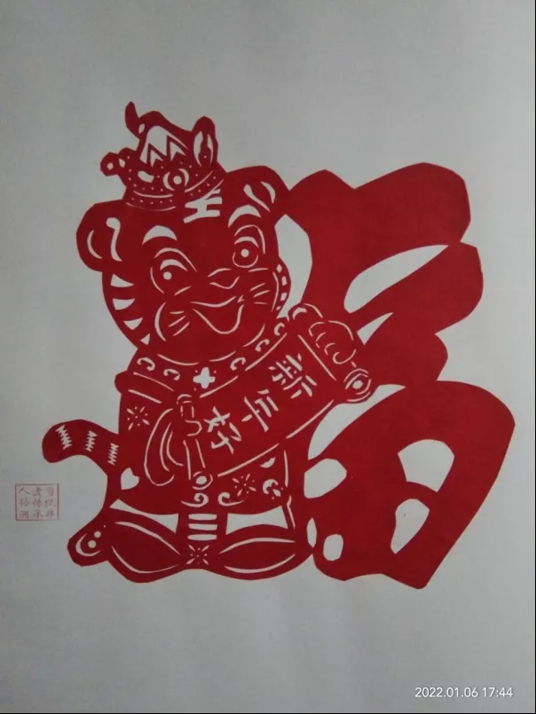 孫潤考慮到老虎很威猛,就用卡通的圖案來體現(xiàn)老虎的可愛。因此選擇將老虎設計為象形“?!弊值钠裕藐幖舻募艏埵址?,采用象形的剪紙技藝,結合虎年的背景,創(chuàng)造出這樣一幅《虎賀新春》。福為虎所依,虎為福所附,福虎相伴,相映呈祥,虎虎生威,祝祖國龍騰虎躍,祝人民生龍活虎!