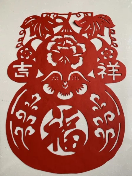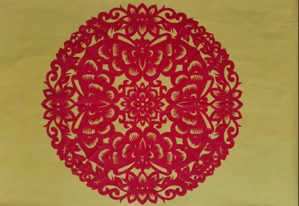 該剪紙使用了老百姓喜聞樂見的萬年紅朱砂紙、色調鮮明,具有濃郁年節(jié)喜慶的中國紅元素。在剪紙技法上,通過上下左右疊成四方并八分之一的對稱單元,只需在八分之一頁面,設計好草稿,依次從內到邊剪出蝴蝶和邊緣弧形菊花裝飾來。團花團圓,一團和美,美好美滿是中華民族和中國人民的期盼和祝愿。蝴蝶團花剪紙,更彰顯出春節(jié)喜慶的美好愿景。