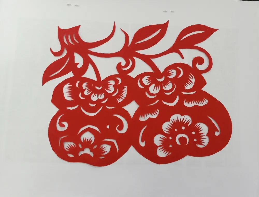 本幅剪紙作品是單幅剪紙,可按照對稱法折疊。該作品上半三分之一為柿子葉片,下半三分之二以柿子為主題,巧妙地塑造了生動形象的外表。柿子的葉邊修飾和細節(jié)裝點渾然一體,構圖嚴謹,畫面具有張力。在古代傳統(tǒng)剪紙文化中柿子因為諧音而具有事事如意,生活美滿的寓意。因“柿”諧音“事”,古人便將諸多種喜慶吉祥的內涵融入其中,如“四世同堂”“事事安順”等。該剪紙作品中的兩個柿子,預示著好事成雙,柿柿如意。甜柿子這種吉祥美好的寓意,正是非遺文化的學習者對朋友、對事業(yè)、對祖國、對未來的殷切期盼和送福之情。
