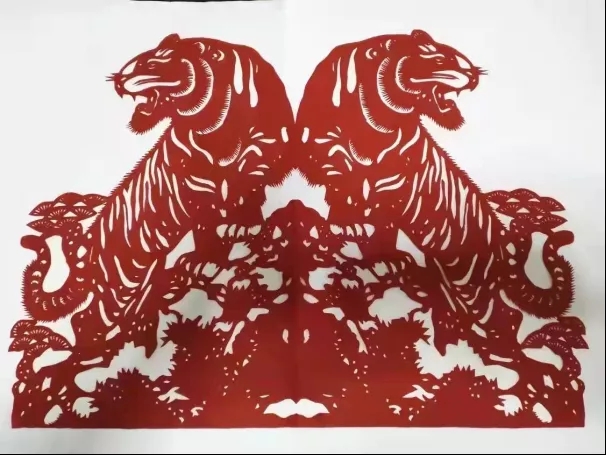 2022年是中國的虎年?;⒁蚺c福諧音,虎年被人們寄予了更多美好的期望?;⑹谦F中之王雄姿矯健,威震千里,一直被當作是權力和力量的象征;虎是一種極具陽剛之氣的動物,它具備勇敢與威嚴;虎是代表吉祥與平安的瑞獸。傳說它能夠驅除一切邪惡。在構思對對虎的剪紙過程中,受到“虎虎生威”這個成語的啟發(fā),認為兩只老虎圖形對稱更加勇猛,形象更加完美,藝術表現(xiàn)力更加生動。經過仔細揣摩構思,用心用情創(chuàng)作,通過對稱的剪法展現(xiàn)了兩只勇猛老虎形象,以虎踞龍盤之姿表達虎年蓬勃希望之意。