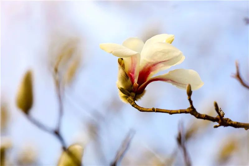 玉蘭花花開(kāi)異常驚艷,花葉舒展而飽滿(mǎn),她經(jīng)常在一片綠意盎然中開(kāi)出大大的白色花朵,因其樹(shù)干高大,開(kāi)花位置較高,迎風(fēng)搖曳,神采奕奕,宛若天女散花。她代表一往無(wú)前的孤寒氣和決絕的孤勇,優(yōu)雅而款款大方。
