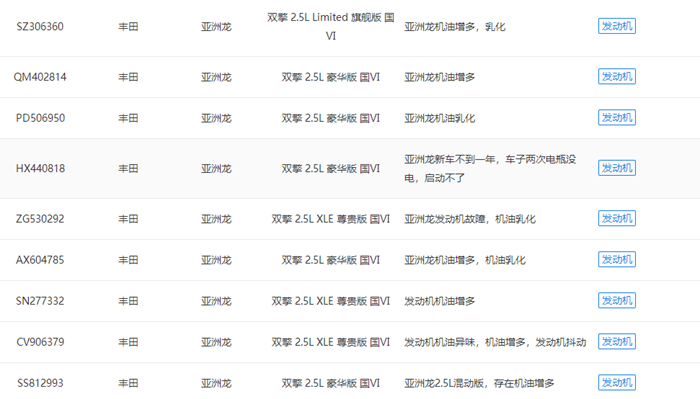 與此同時(shí),在中國(guó)網(wǎng)汽車質(zhì)量投訴平臺(tái)上,一汽豐田2019款亞洲龍2.0L燃油版也被爆出“發(fā)動(dòng)機(jī)連續(xù)無(wú)故熄火、故障燈亮起”的故障。而更早時(shí)候,一汽豐田亞洲龍則被異響以及“機(jī)油增多”等問題纏身。實(shí)際上,自2019年上市后不久,亞洲龍就頻繁出現(xiàn)天窗異響、車內(nèi)異響、中控異響等問題,也引發(fā)了大量車主的投訴。同時(shí),冬季雙擎車型“機(jī)油增多”的問題,更引發(fā)外界強(qiáng)烈關(guān)注。主要是因?yàn)榘l(fā)動(dòng)機(jī)反復(fù)在冬季無(wú)法充分暖機(jī)的狀態(tài)下使用時(shí),發(fā)動(dòng)機(jī)內(nèi)少量的結(jié)露水不能蒸發(fā),且混入到發(fā)動(dòng)機(jī)機(jī)油里,使得發(fā)動(dòng)機(jī)無(wú)法獲得充分潤(rùn)滑,由此引發(fā)了車主們對(duì)發(fā)動(dòng)機(jī)使用壽命的擔(dān)憂,紛紛要求豐田為雙擎車輛發(fā)動(dòng)機(jī)提供延長(zhǎng)質(zhì)保年限服務(wù),但最終并未予以采納。